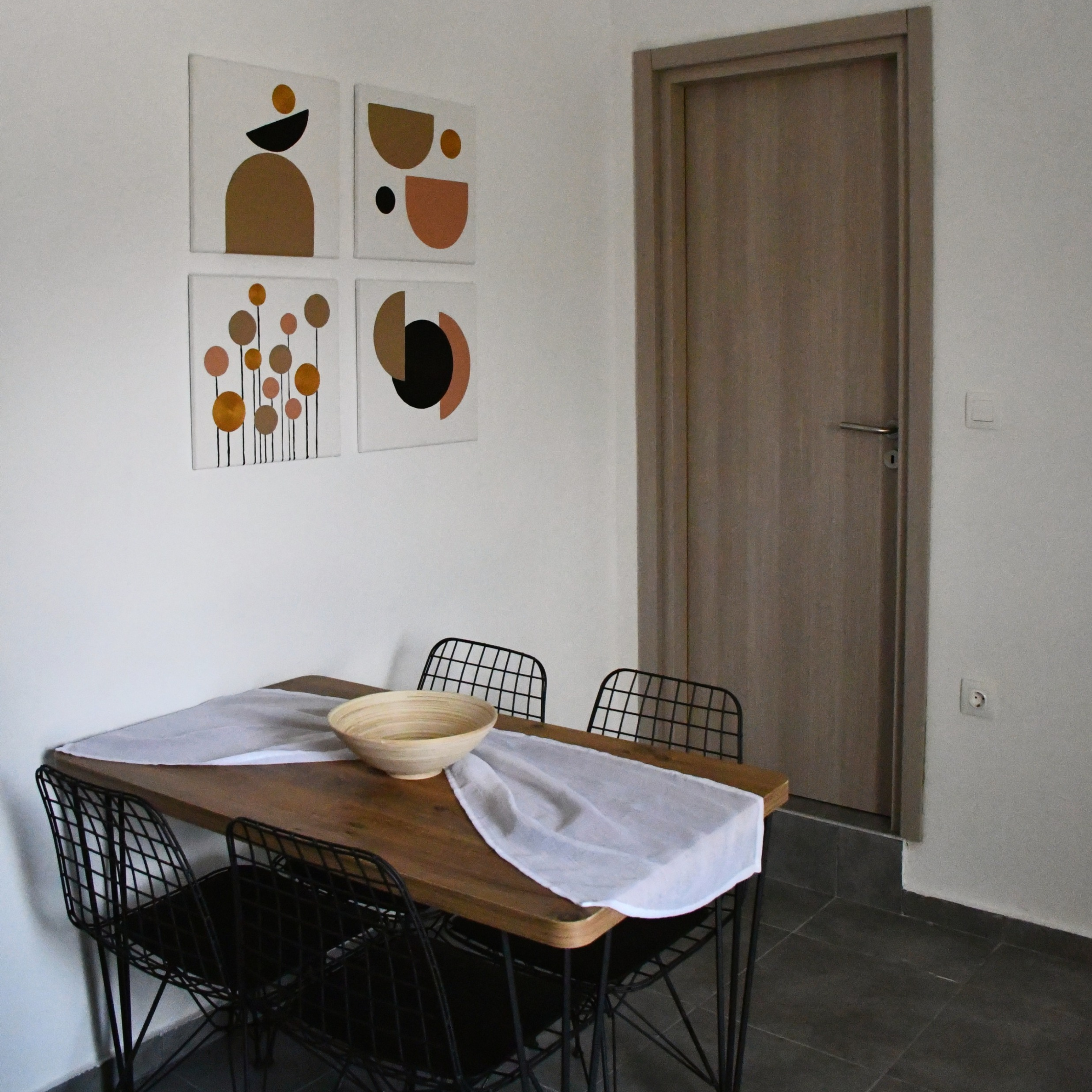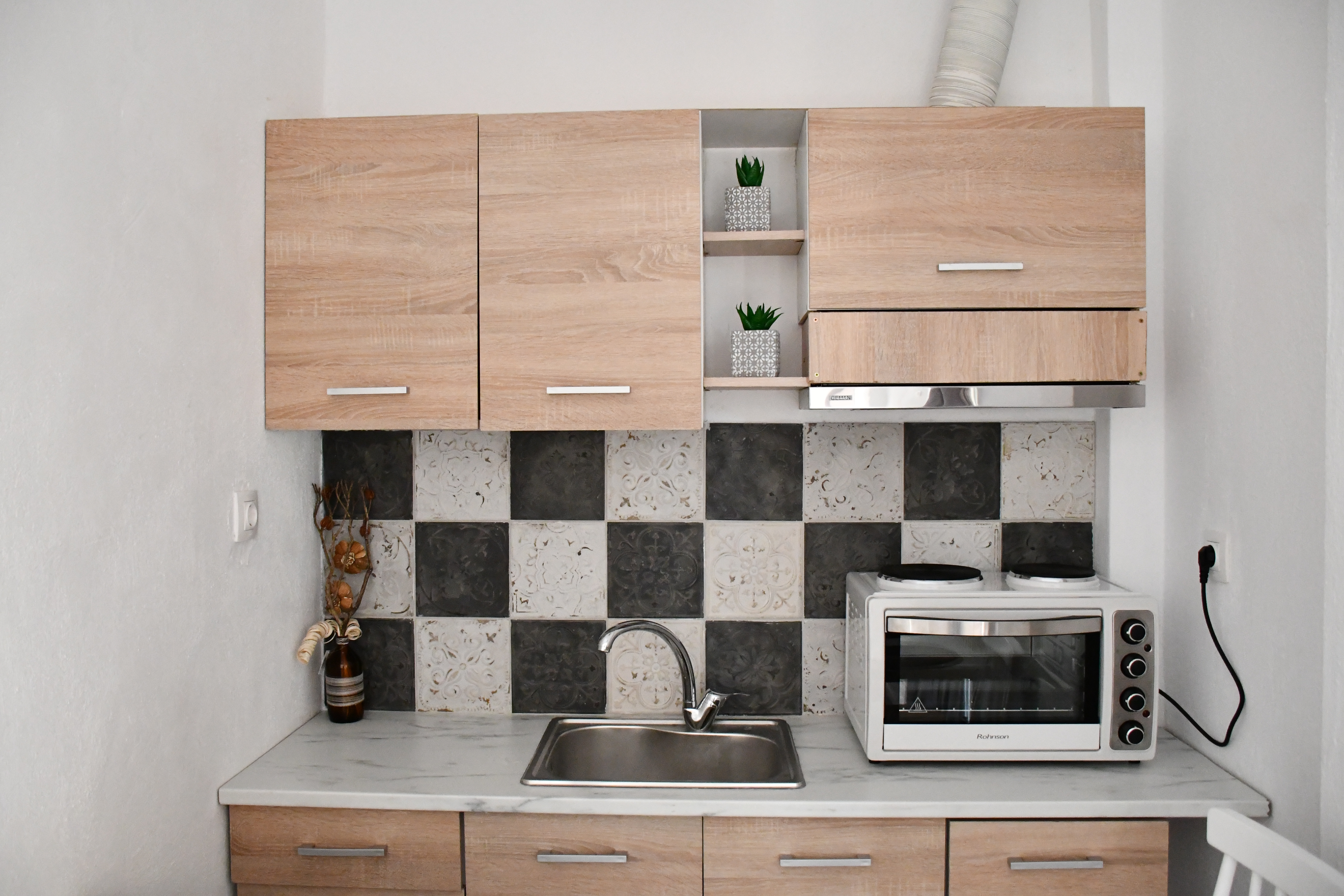 Kounia, which translates to ‘swing’ in Greek, offers a playful yet peaceful escape. The centerpiece of this studio is a beautifully knitted swing, hanging gracefully in the center of the room, inviting guests to unwind in a unique way. This feature adds a sense of fun and relaxation, perfect for couples and families of 3 who are looking to add a bit of whimsy to their vacation. The studio combines this playful element with all the necessary comforts, from a fully-equipped kitchen to a cozy sleeping area, making it an ideal choice for both adventurous and leisure-seeking travelers.