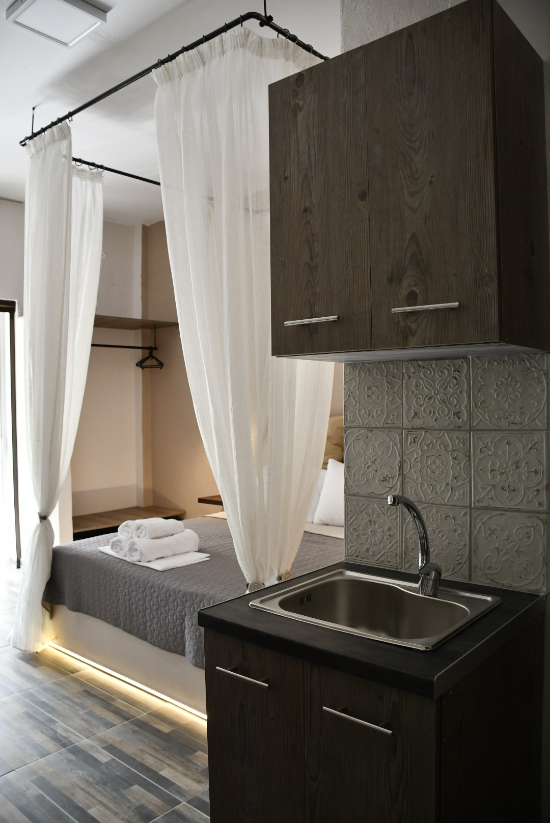 Kourtines, meaning ‘curtains’ in Greek, is a sanctuary of romance and serenity. This studio is specially designed to kindle love and intimacy, featuring a charming bed adorned with elegant curtains that create a dreamy, secluded atmosphere. The soft, flowing fabrics add a touch of whimsy and privacy, making it an ideal retreat for couples seeking a romantic getaway. The studio is equipped with all modern amenities, ensuring a comfortable and memorable stay.
